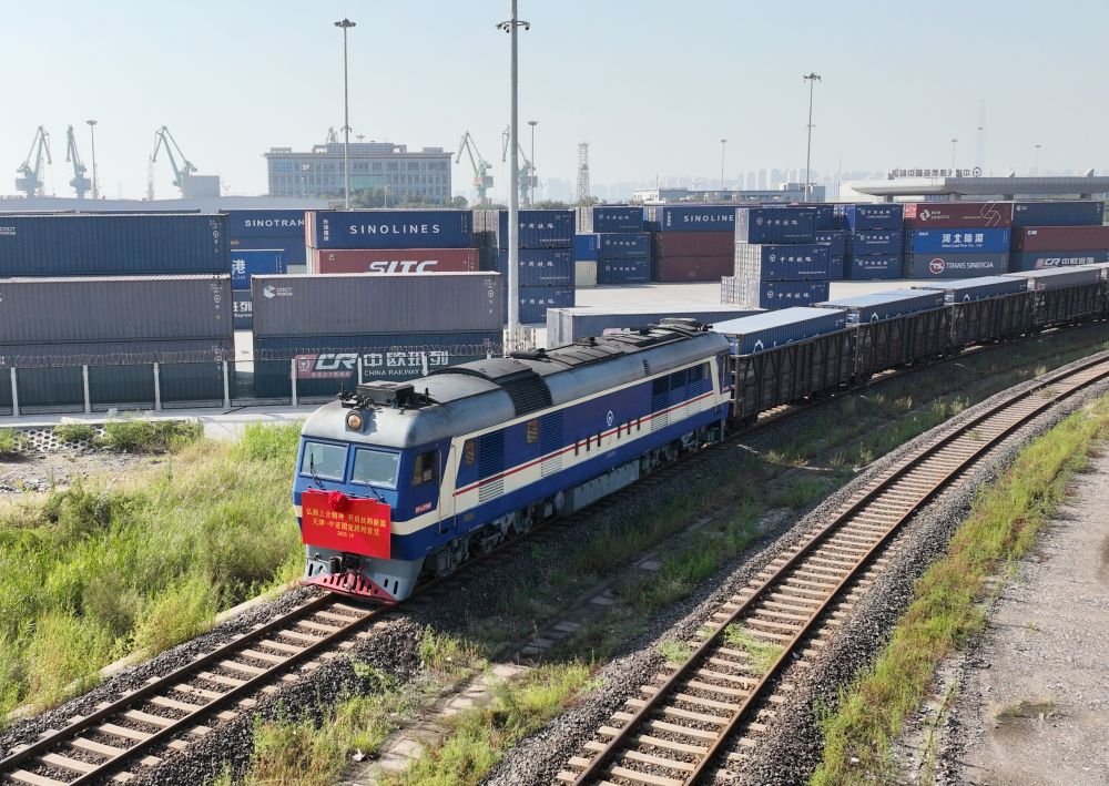 2025年10月13日拍摄的天津-中亚图定班列首发现场(无人机照片)。新华社记者 李然 摄\n\t(二)